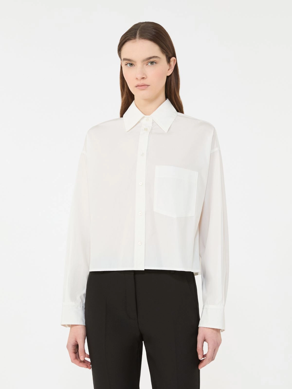 Classic-inspired cropped shirt with pleat motif at the back and patch chest pocket on the left.